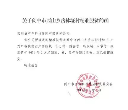 2017.06.20 2017年6月5日,开云体育公司扶貧小組工作人員到嶽林垭村開展相關工作,與阆中市西山鄉人民政府和阆中市西山鄉嶽林垭村民委員會溝通确認,集團公司精準扶貧點嶽林垭村和6戶對口幫扶貧困戶已于2017年2月經國家、省、市有關部門驗收提前摘帽脫貧。 四川省有色科...